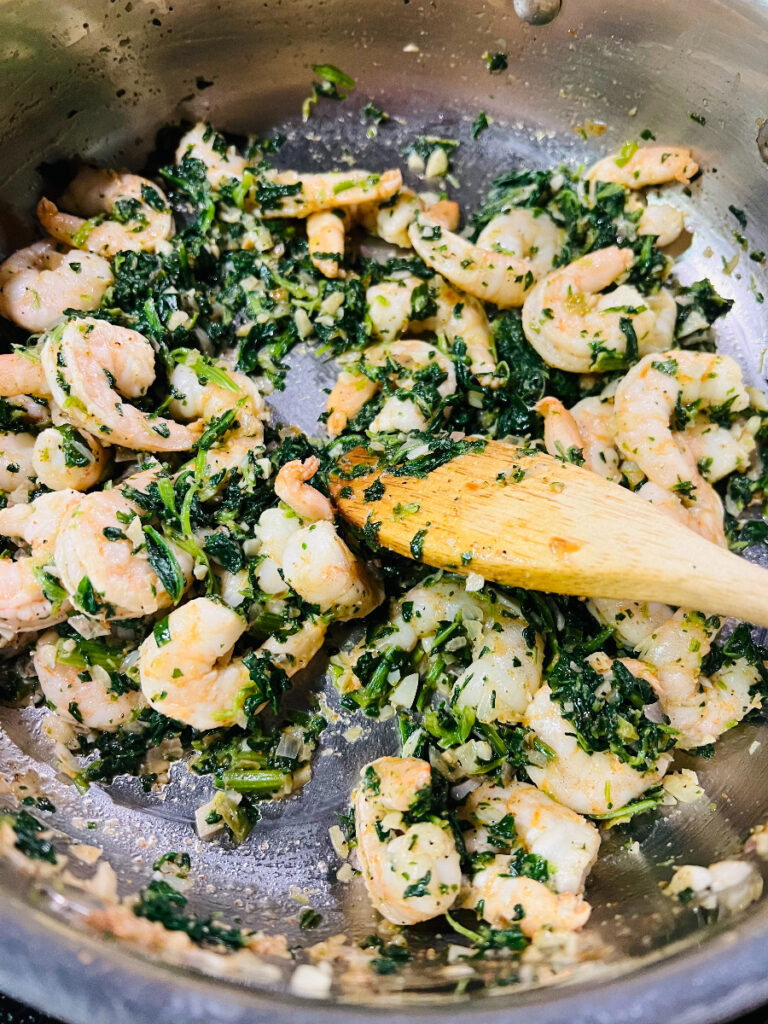 This Creole Shrimp & Spinach in Creamy Tarragon Sauce comes together quickly, so I highly recommend getting all your ingredients prepped before beginning to cook. Blend up the sauce and chop the aromatics. If using frozen spinach, thaw and squeeze it well to remove as much water as possible -- no one likes soggy spinach! Then just saute the shallots, green onion and garlic, add the shrimp and spinach, and finish with the sauce, herbs and seasoning. Serve immediately!