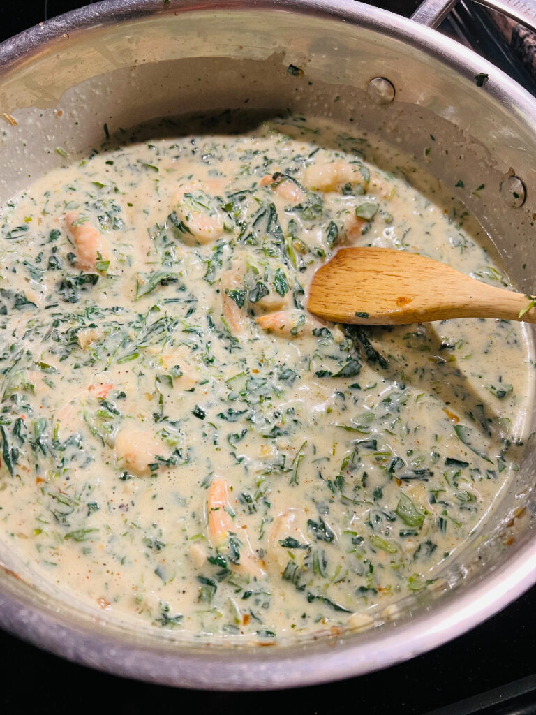Stir in the spinach and cook for another minute. Then add the sauce, Creole seasoning, parsley and tarragon.